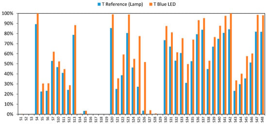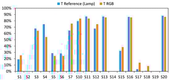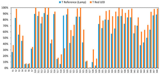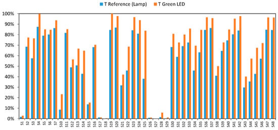 We began our study by analyzing what responses would be obtained when each individual LEDs (red, green, or blue) was turned on separately. Taking the green LED (500 to 550 nm, and 525 nm peak) as an example, Figure 5 shows that the transmission values achieved by the green LED were higher than those provided by the incandescent lamp at 525 nm for the samples detailed in Table 1.