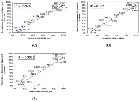 Comparative results of the transmittance values between commercial equipment based on the incandescent lamp (blue) and RGB-LED device developed (red) after the calibration within 510–645 nm, for the following samples used during the calibration process: (A) S7, (B) S12, (C) S15, (D) S16, and (E) S20.