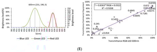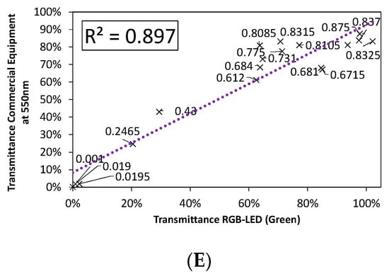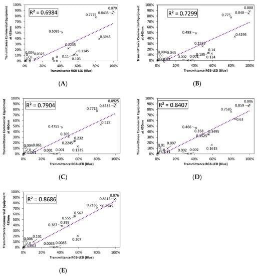 In order to understand the low performance of the RGB blue LED, Figure 11 shows the transmittance correlation of a single blue LED, with a peak wavelength of 460 nm, which does not belong to an RGB LED but coincides with its peak wavelength (Figure 10D).