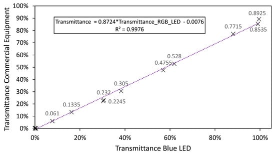 Our investigations concluded that there is a linear relation between the transmittance values provided by the RGB-LED when it uses each of its LEDs (red, green, and blue) independently, and those values that would be obtained with commercial equipment working at the same peak wavelength as the mentioned LEDs.