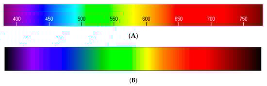 (A) Comparative visible spectrum based on RGB equivalence equations- λ. (B) Real visible spectrum.