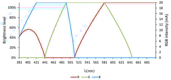 The determination of the correlation between RGB and the wavelength Lambda (λ) is carried out by several sets of equations grouped by spectral regions, as presented in Equation (1), where , and are the red, green, and blue adopted values in the 0–1 range, respectively, without considering the brightness level Y: