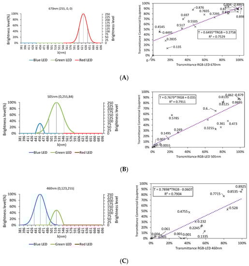This will allow us to obtain the correlations, in terms of transmittance, between the light wavelengths contained in the range from 380 to 700 nm and the RGB values, from the point of view of color representation. We observed that those color combinations (red, green, and blue) that are visually closer to the wavelength we seek to model (Figure 13A) produce transmittance values that reach a linear correlation with the transmittance values obtained with commercial equipment based on incandescent lamps (Figure 13B). Figure 13A was obtained from the RGB combinations provided by the equations that will be shown in this section.