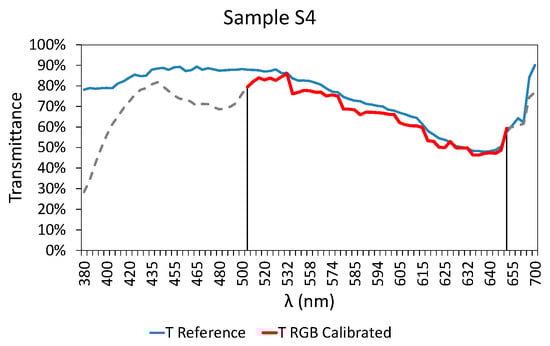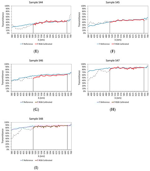 As can be seen, the charts shown in Figure 19 how a good level of fit within the 510–645 nm zone. Outside that range, the transmittance values differ from those provided by the reference equipment (incandescent lamp).