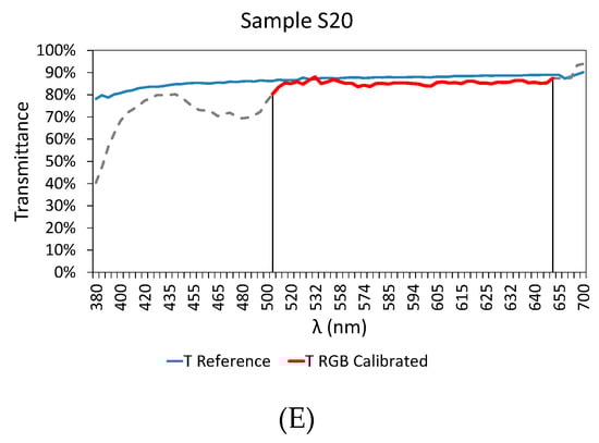As can be observed in Figure 20, all the samples analyzed show a high accuracy according to the transmittance values provided by the commercial equipment based on incandescent lamps within 510 nm to 645 nm.