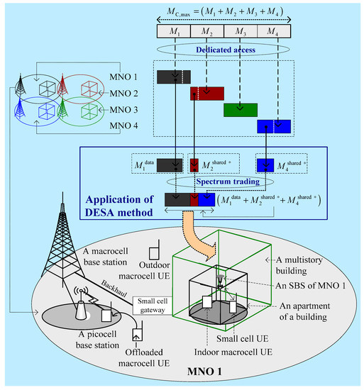 Consider that there are O MNOs operating in a country, each consisting of three types of BSs: macrocell BSs (MBSs), picocell BSs (PBSs), and small cell BSs (SBSs). Figure 1 shows the system architecture for O = 4. For simplicity, we show only one macrocell per MNO in Figure 1. Moreover, we assume that all MNOs have similar system architectural features such that the detailed architecture, including the application of the proposed DESA method, only for MNO 1 is shown in Figure 1. Note that, in regard to applying DESA, we assume that MNO 1 lacks a sufficient amount of spectrum to serve its data traffic such that it leases the corresponding amount of spectrum from MNO 2 and MNO 4 (Figure 1). We discuss in detail the proposed DESA method in the following section.
