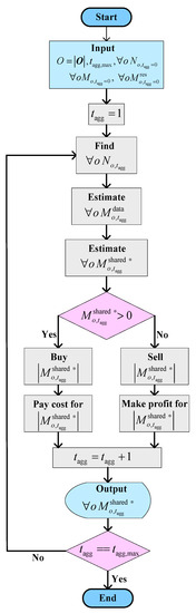 The same process described above is executed at each agreement term. If an MNO o with a positive sign of at the agreement term tagg is found with a negative sign of in the next agreement term tagg+1, the MNO can take its shared spectrum at tagg back from the corresponding MNO. Moreover, if an MNO o requires more spectrum (even after taking back its shared spectrum) to serve its user data traffic demand, the MNO o can buy additional spectra from other MNOs with a negative sign of at tagg + 1. This process is applicable for all MNOs at each agreement term to update on-demand basis spectrum leasing among each other flexibly so that both the QoS as well as the profit gain from either the unused or the under-utilized spectrum can be achieved to improve the overall countrywide spectrum utilization. A flowchart of the algorithm for four MNOs is shown in Figure 3.