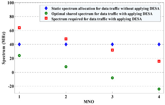 The proposed DESA method stated above considers exploiting the secondary spectrum trading such that, unlike the individual authorization (i.e., licensed or static access) method, the licensed spectrum of an MNO can be used by other licensed MNOs of a country, usually for a short duration, with mutual understanding between MNOs. Further, the shared or leased spectrum by an MNO can be given back to the original licensee after the agreement term if the shared spectrum is found unused or under-utilized. In addition, usually, a portion of the licensed spectrum of an MNO is shared with other MNOs to dynamically meet user demands of both MNOs by periodically revising the shared spectra of each MNO at each agreement term.