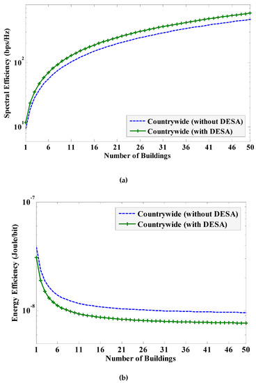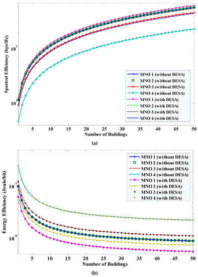 Now, using Figure 7, the countrywide average SE and average EE responses due to reusing the same mmWave spectrum to L buildings of small cells per MNO are also given in Table 2. In Table 2, it can be found that, without applying DESA to all MNOs countrywide, the number of buildings of small cells per MNO required to achieve the SE and EE requirements for 6G mobile systems is 40. However, when applying DESA to all MNOs countrywide, the required number of buildings is reduced (by 20% of that required without applying DESA) to 32. Hence, by applying DESA, the expected SE and EE requirements for 6G mobile systems can be achieved by reusing the same 28 GHz mmWave spectrum to 47.5%, 15%, and 20% fewer buildings of small cells, respectively, for MNO 4, MNO 3, and all MNOs countrywide.