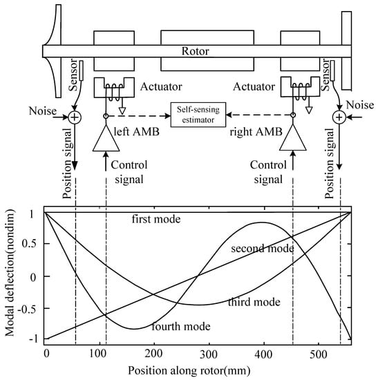 For the rotating machinery of pumps, generators, turbomachines or machine tools, the rotors are generally supported by hydraulic bearings, composite ceramic bearings or magnetic bearings. Due to their high-speed rotation, high efficiency and low maintenance demand, active magnetic bearings (AMBs) have been applied in a series of modern industrial high-speed motor systems to replace conventional bearings. However, their geometric size, manufacturing cost and work reliability are disadvantageous as they comprise numerous components, such as wires, electromagnetic actuators, sensors and controllers. If some of these components are eliminated or integrated, the cost and size can be reduced, and the system reliability can be improved. The first self-sensing method proposed by Vischer [] is based on the Luenberger model, but its estimation results are sensitive to systematic parameter changes. However, Cannon et al. [] and Karkoub et al. [] found that stable control is easy to achieve in flexible structures with co-located sensors and actuators. For example, a generic AMB-supported rotor, peripheral hardware and free–free rotor mode [] are shown in Figure 1. This AMB structure is non-collocated because the position sensor is set beside the actuator (electromagnet); the phase difference between the position sensor and the actuator can be potentially dangerous if the rotor is running in a high-order mode. Then, the co-located solution, called self-sensing method, is developed, and the phase difference will be eliminated because the position sensor and the actuator will combine.