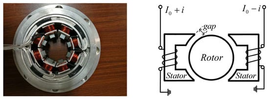 Eight-pole heteropolar radial stator (left) and single-degree-of-freedom (DOF) model of AMB (right).