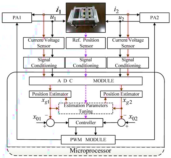 - Glück, T.; Kemmetmüller, W.; Tump, C.; Kugi, A. A novel robust position estimator for self-sensing magnetic levitation systems based on least squares identification. Control Eng. Pract. 2011, 19, 146–157. [Google Scholar] [CrossRef]