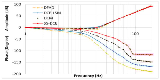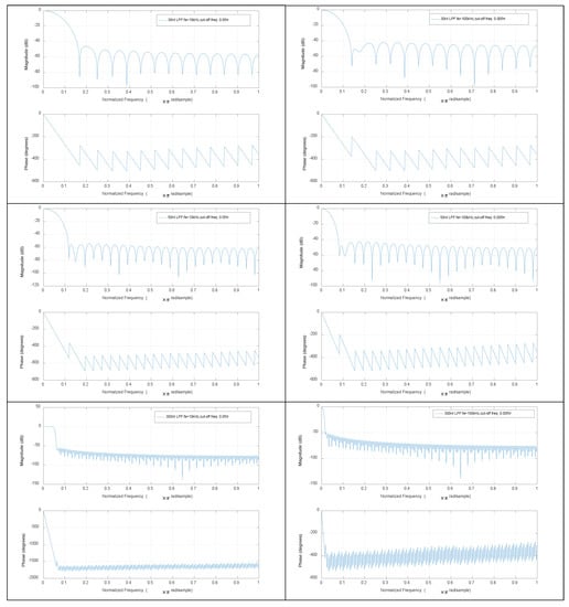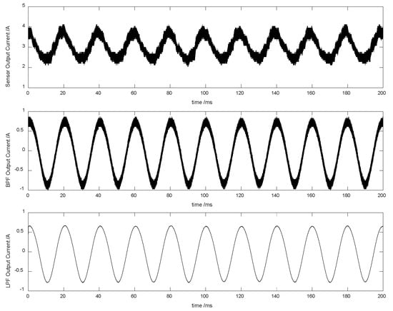 The Bode plots of BPF are shown in Figure 12. The band-pass of 30-, 50- and 300th order BPFs was 0.3–0.5π when the sample frequency fs = 10 kHz. The 30th order filter precision was the lowest level, but its phase lag was the smallest; the 300th order filter precision was the highest level, but its phase lag was the largest. When the sample frequency fs = 100 kHz, BPFs’ Bode plots were noticeably closer to the corresponding LPFs. Accordingly, BPF could be replaced by LPF in practice because the former had a low-pass effect and the fundamental ripple was just 2 kHz. The Bode plots of the last LPF were shown in Figure 13, from which similar conclusions could be drawn. The 30th order filters of BPF and LPF were qualified for the self-sensing process. The 50-Hz working currents by sensor, BPF and LPF in the DFAD estimator were shown in Figure 14. Since the power frequency was 50 Hz, the noise and disturbance of 50 Hz were obvious, and significantly, the self-sensing estimator was tested at 50 Hz.