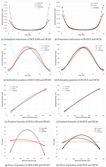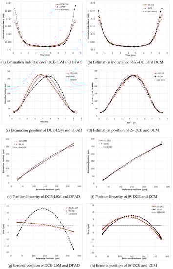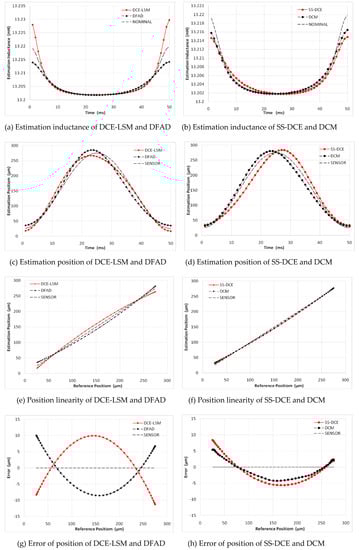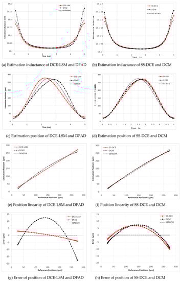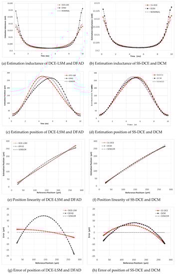 In this study, the simulation and experimental resulted were compared with several other estimation algorithms, including the DFAD approach, DCM approach and DCE-LSM and SS-DCE position estimation approaches. The current and voltage signals were digitized via a 100-kHz A/D converter when filtered by the analog BPFs that isolate the fundamental component to improve the sampling resolution. Then, the ideal absolute value functions were implemented to detect the envelope of the fundamental component of the current and voltage, and the position information was shifted to low frequencies. LPFs can select only low-frequency baseband signals as the control signal. An FIR filter was employed in the digital signal processor.