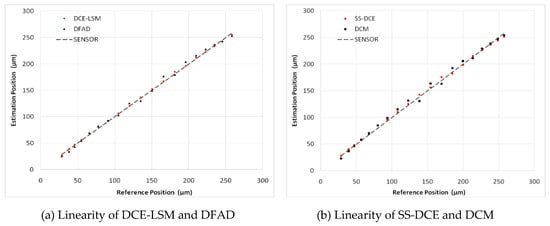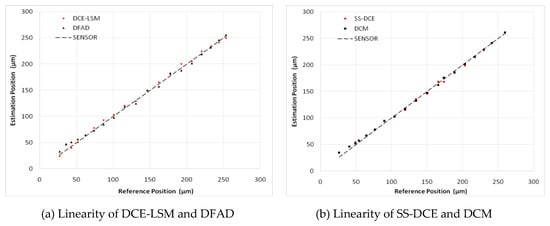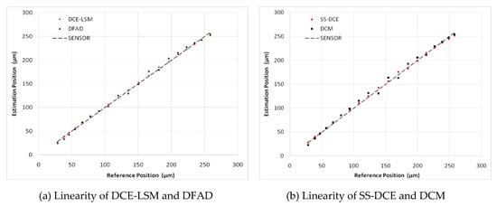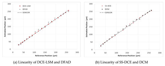 Compared to these different methods, the SS-DCE approach had great advantages regarding its estimator. When the test frequency (20 Hz) was close to the natural frequency, the error and precision of all estimators achieved the best performance. When the test frequency was far from the natural frequency, the DCE-LSM estimation’s linearity was better than that of the others; the simulation result was less than 2%, and the corresponding experimental result was about 2% in the 50–250 μm range. Due to more additional phase-shifts introduced in the sensor process, the linearity of DFAD was the poorest, and the estimation linearity presented was about 6%. Similar linearity between SS-DCE and DCM was less than 4%. However, SS-DCE had an excellent dynamics performance in the open-loop state, which was evaluated by a frequency response analysis; a 158° phase margin was shown as at the natural frequency of 19.26 Hz, and the sensitivity peak is 10.7 dB in the 50–250 μm range.