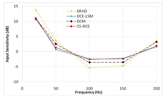 The input sensitivity analysis was operated according to ISO-14,839–3 because no robustness indicators exist for self-sensing AMBs. In Figure 28, the suspended rotor was excited by a sinusoidal signal with a 10-μm peak–peak value from 20 to 200 Hz. The results demonstrate that the input sensitivity peak value listed in Table 4 occurred when the frequency (20 Hz) was close to the natural frequency; the AMBs with SS-DCE kept the lowest sensitivity.