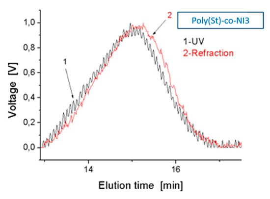 The molecular weight characteristics obtained from GPC (Mw and Mn) and polydispersity Mw/Mn of poly (St-co-NI3) and poly(St-co-NI4) are summarized in Table 1. The data confirms the formation of high molecular weight polymers. Comparing the data for both copolymers, it is seen that poly(St-co-NI4) has higher molecular weights due to the position of the allyl group. In this case, the allyl group bonded to the amide nitrogen atom was more polarized and more active than when it was at the C-4 position. This, in turn, led to the production of a copolymer with a higher molecular weight. Due to the low concentration of the NI3 linked to the main polystyrene macromolecule, it was not possible to use NMR spectroscopy to unequivocally prove the chemical bond between them. The new poly(St-co-NI3) copolymer was characterized by gel permeation chromatography with double detection: refraction and UV-Vis at 423 nm. The elution time values obtained in both chromatograms were very close (Figure 1), which indicates that poly(St-co-NI3) was absorbed at 423 nm. This result is indicative of formation of covalent bond between NI3 and main polystyrene chain.