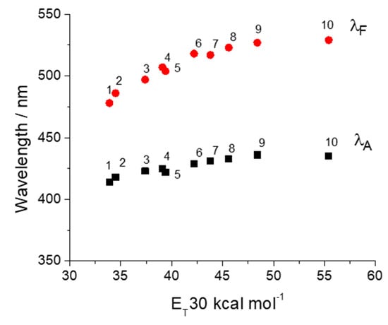 In all investigated organic solvents, NI3 had a yellow color with yellow-green fluorescence. The long-wavelength bands of the absorption spectra in the visible region were bands of charge transfer/CT/due to the π→π electron transfer on the S0→S1 transition. The absorption maxima λA were in the visible region at 414–436 nm and the respective fluorescence maxima were between 478 ÷ 529 nm. Figure 3 presents the dependence of the absorption position and fluorescence maxima of compound NI3 from the polarity of organic solvents. As seen, the nature and the polarity of the organic solvents had significant influence on the spectral properties of NI3. Changes in the position of the NI3 CT bands in the solvents were brought about by the solvents’ solvatochromic effect. In comparison with the polar methanol, the absorption and fluorescent maxima in apolar toluene solvent were hypsohromically shifted (ΔλA = 22 nm and ΔλF = 51 nm), as the polarization of the chromophoric molecules depended strongly on the solvents polarity, as well as on the specific NI3-solvent interactions, which caused a change in the polarization of the 1,8-naphthalimide chromophore system. As can be seen, NI3 displayed a positive solvatochromism.