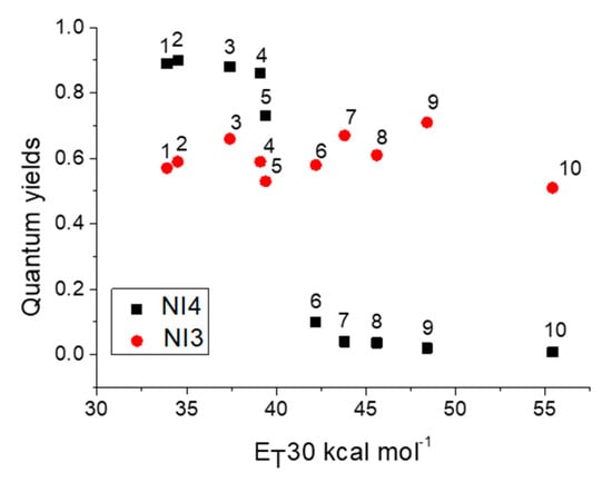 Dependence of quantum fluorescence yields of NI3 and NI4 on the empirical parameter of solvent polarity ET (30): 1-toluene, 2-diethyl ether, 3-tetrahydrofuran, 4-chloroform, 5-dichloromethane, 6-acetone, 7-DMF, 8-acetonitrile, 9-2-propanol-2, 10-methanol.
