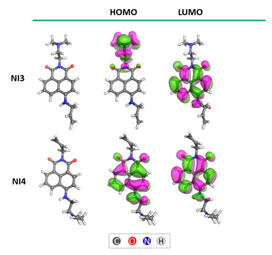 The first excited states were determined by HOMO-LUMO transitions with oscillator strengths f in the range 0.27–0.34. The optimized geometries and frontier orbitals of compounds NI3 and NI4 are shown in Figure 5. HOMO orbitals were located differently for NI3 and NI4. For NI3, it was located on the N,N-dimethylaminoethylendiamine receptor fragment and for NI4 it was located entirely on the 1,8-naphtalimide core. LUMOs were delocalized on the 1,8-naphtalimide cores for both compounds. These differences in the spatial distribution of the frontier orbitals (HOMOs) explain the different photophysical properties of NI3 and NI4.