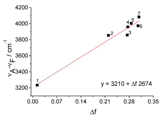 Dependence of the Stokes shift (υA−υF) on solvent polarity function Δf for NI3 in organic solvents: 1-toluene, 2-dichloromethane, 3-acetone, 4-DMF, 5-acetonitrile, 6-2-propanol, and 7-methanol.