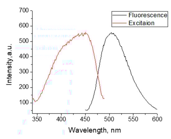 The photophysical characteristics of the poly(St-co-N3) were also examined in the toluene solution, where the copolymer was well soluble and in a thin polymer film (60 μm). In 2% toluene solution, poly(St-co-NI3) has absorption maximum at 408 nm and emits fluorescence with maximum at 474 nm, with a Stokes shift of 3412 cm−1. The calculated quantum yield was ΦF = 0.51. These values were very close to those obtained from the free monomeric NI3. This indicates that the chromophore system did not change during the co-polymerization, nor for the main polymer chain binding. Figure 7 shows the excitation and fluorescence spectra of the thin poly(St-co-NI3) film. The excitation spectrum maximum was at 451 nm, while the fluorescence peak was at 502 nm. The bathochromic shift of excitation and fluorescence maxima compared to those in the toluene solution can be explained by the solid fixation of NI3 into the polymer matrix and the inability to undergo conformational changes [40,41].