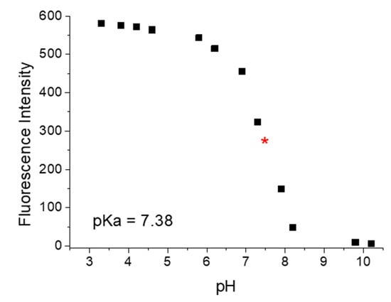 The dependence of the fluorescent intensity from pH was analyzed by Equation (2):