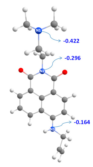 The Hirshfeld atomic charge was obtained for the optimization in water environment. NI3 geometry showed that N,N-dimethylamino group protonation was the most probable one (Figure 9). DFT calculations were carried out on a different N-protonated species in the gas-phase and in water. It was further confirmed that the protonation occurred in the N,N-dimethylamino group’s nitrogen atom (Table 4).