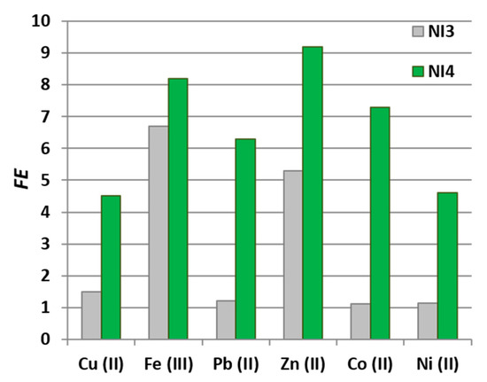 Different metal cations (Cu(II), Fe(III), Pb(II), Zn(II), Co(II) and Ni(II)) were used to investigate the detection ability of NI3 and NI4. As a qualitative indicator of the influence of metal ions on a compound’s fluorescent intensity, the fluorescence enhancement factor (FE = I/Io) was calculated from the ratio of the maximum fluorescent intensity (I: after adding metal ions) and the minimum fluorescent intensity (Io: free of metal ions). Figure 10 plots the enhancement of the fluorescent intensity of both compounds in the presence of the metal cations. An enhancement of the fluorescence intensities was observed in NI4 (FE = 4.5 ÷ 9.2), while in NI3 the metal ions had a negligible effect on fluorescent intensity (FE = 1.2÷1.5). This was true except for Fe(III), where the increase in fluorescent intensity was significant (FE = 6.7 and Zn(II) with FF = 5.2). The great difference in the fluorescent intensity of NI3 and NI4 was induced by metal cations and can be explained by the different structure and stability of the respective tetraaqua complexes.