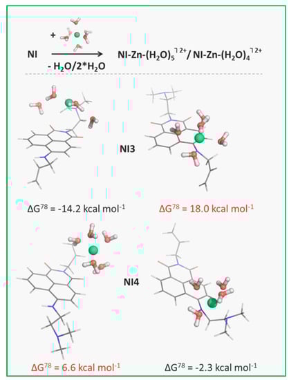 Modeled reaction between NI3/NI4 and hydrated Zn2+ ions, as well as possible NI3-Zn2+ and NI4-Zn2+ complexes. The free energies ΔG78 (in kcal mol−1) for the complex formation reactions are shown.
