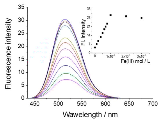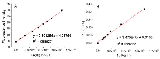 where F is the measured fluorescent intensity, Fo is the fluorescent intensity of free ligand NI3, and Fmax is the saturated fluorescent intensity of the complex NI3-Fe(III). From the obtained linear relationship (Figure 14B) (R2 = 0.996), the association constant of NI3 with Fe(III) ions was calculated as Ka = 1.12 × 105 M−1.