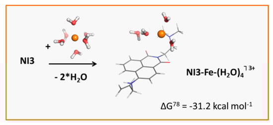 A complex between NI3 and Fe(III) ions was also modeled (Figure 13). The value of the Gibbs energy indicated a strong preference towards the triply charged Fe(III) ions (ΔG78 = −31.2 kcal mol−1). As Figure 11 and Figure 13 demonstrate, the first-shell water molecules in NI3-Zn-(H2O)4┐2+ and NI3-Fe-(H2O)4┐3+ were arranged differently around the metal center. As a result, Fe(III) coordinated strongly with the tertiary amino group of the receptor fragment (2.18 Å bond length) and with one of the carbonyl group (a water mediated contact).