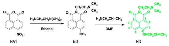 Herein, 4-Nitro-1,8-naphthalic anhydride (NA1) was used as an initial product for the synthesis of NI3 (Scheme 1). Its reaction with N, N-dimethylaminoethylendiamine in an ethanol solution yielded 2-(2-(dimethylamino)ethyl)-6-nitro-1H-benzo[de]isoquinoline-1,3(2H)-dione (NI2). The final product (NI3) was obtained after nucleophilic substitution of the nitro group from NI2 with an allylamino group. The chemical structure of the new compound NI3 was characterized by FTIR, 1H and 13C NMR spectra, as well as an elemental analysis.