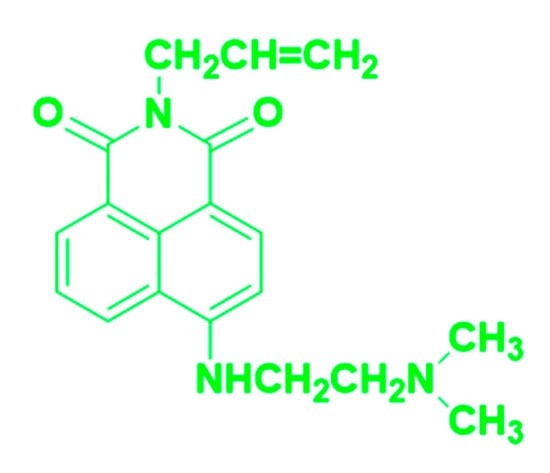 Derivatives of 1,8-naphthalimide have been increasingly investigated as a signaling unit in the design of sensor systems for the detection of cations, anions, or neutral analytes, which are major industrial environmental pollutants [12,13,14,15,16,17]. For the first time, we have combined the sensor activity of 1,8-naphthalimides with their ability to copolymerize with vinyl and methacrylate monomers to produce polymeric sensors [18]. An allyl group directly attached to the imide nitrogen atom was used as a polymerization group. On the other hand, the groups as N,N-dimethylaminoethylamino [18], N,N-dimethylaminoethyloxy [19], or N-methylpiperazine [20] were introduced at the C-4 position for their use as receptor fragments to react with metal ions and protons in the sensor system design, working in the photo-induced electron transfer (PET) mode.