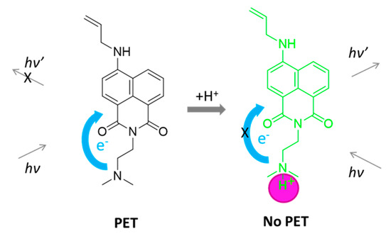 - Grabchev, I.; Qian, X.; Xiao, Y.; Zhang, R. Novel heterogeneous PET fluorescent sensors selective for transition metal ions or protons: Polymers regularly labelled with naphthalimide. New J. Chem. 2002, 26, 920–926. [Google Scholar] [CrossRef]