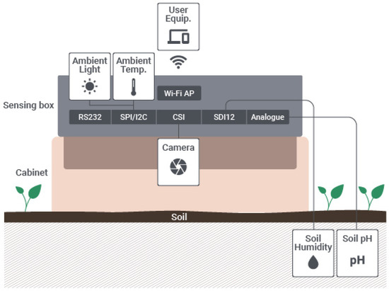 Figure 1 presents the high-level architecture of the IoT sensing platform with its collection of sensors and interfaces, as well as the radio communication interface, which allows the collected data to be relayed to a user equipment (UE) (e.g., smartphone, tablet, laptop), according to the specificities of application use cases. Moreover, the architecture showcases the camera and the cabinet that isolates from natural light the soil to be captured, and later analysed.