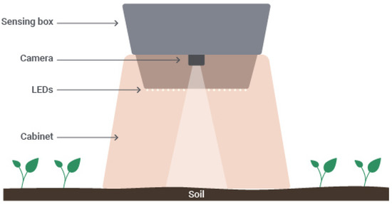 In what concerns the computer vision component, Figure 2 illustrates the structure that relies on the camera sensor, LEDs and cabinet for soil image acquisition, further detailed in Section 3.3.