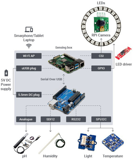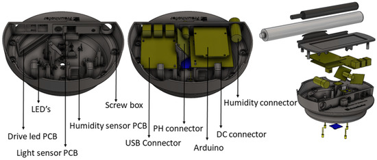 All these components can be easily connected to each other using standard equipment and connection interfaces. In addition to the inner hardware of the sensing box, it was also defined the set of sensors to measure pH, moisture, air temperature, light: