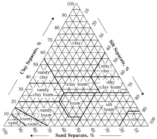 Figure 5. USDA soil texture triangle. A diagram with soil types according to their clay, silt and sand composition [45].
