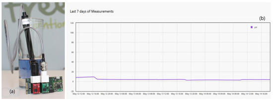 Figure 11. (a) Testing pH sensor; (b) PANDLETS web interface data graph.