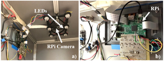 Figure 13. Computer vision prototype: (a) LEDs and RPi camera; (b) control unit including the Raspberry Pi.