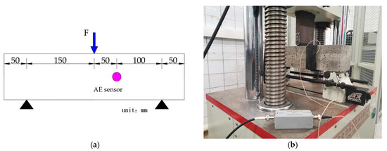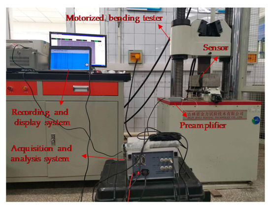 The compressive strength and flexural strength of CRBFC were tested according to national standard GB/T50081–2002 [43]. The 100 × 100 × 100 mm specimen was used for the compressive strength test. The 100 × 100 × 400 mm specimen was used for the flexural strength test. The flexural strength was tested by a three-point bending test, and the distance between the two fulcrum points was 300 mm. The AE technology was used to real-time monitor the fracture behavior of CRBFC under three-point flexural conditions. The specific experimental device is shown in Figure 2.