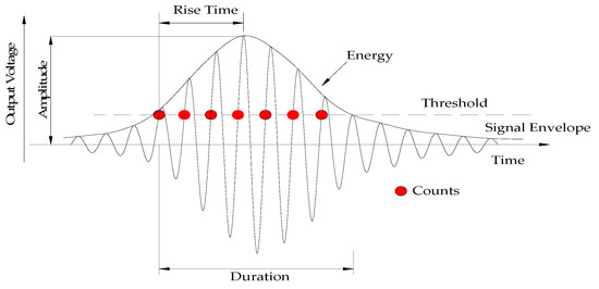 The variation in AE signal parameters is related to change in the internal structure of concrete. The elastic wave generated by damage to the internal structure of concrete propagates to the surface of the AE sensor and converts it into an electrical signal. The electrical signal is processed and calculated by the acquisition and analysis system into a set of signal parameters to characterize the digitized AE waveform. AE signal parameters collected by the AE measurement system are shown in Figure 3. The threshold value set by the user is the key AE parameter and has an effect on the accuracy of the data. AE amplitude refers to the maximum amplitude value of the corresponding event signal waveform, and the unit is decibels (dB). Rise time refers to the time interval from when the event signal first crosses the threshold until it reaches the maximum amplitude, and the unit is microseconds (μs). Duration refers to the time interval between when the event signal first crosses the threshold and the final drops to the threshold, and the unit is microseconds (μs). AE energy refers to the elastic energy released by AE events, and the unit is mv∙μs. Counts refers to the number of AE amplitudes that cross the threshold.