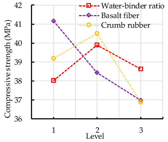 The range analysis of the compressive strength of CRBFC is shown in Table 8. The range values of water–binder ratio, basalt fiber content, crumb rubber replacement rate and error were calculated, and the error range is the minimum. This indicates that the effect of error on the experiment results is less than that of the three independent factors. It can be seen from Table 8 that the basalt fiber content has the greatest effect on the compressive strength of CRBFC, followed by crumb rubber replacement rate and water–binder ratio. The effects of water–binder ratio, basalt fiber content and crumb rubber replacement rate on the compressive strength of CRBFC are shown in Figure 5. The compressive strength of CRBFC increases first and then decreases with the increase in water–binder ratio. The compressive strength of CRBFC decreases with the increase in basalt fiber content. The appropriate amount of fiber submits a three-dimensional random distribution, which limits the transverse deformation of concrete under compressive conditions. However, excessive fibers will absorb the water in the concrete mixture, which restricts the hydration of cement and reduces the compressive strength of concrete. The compressive strength of CRBFC increases first and then decreases with the increase in crumb rubber replacement rate. When the crumb rubber replacement rate is lower than 10%, the positive effect of sodium hydroxide solution modification is stronger than the negative effect of crumb rubber incorporation; when the crumb rubber replacement rate is higher than 10%, the negative effect of crumb rubber incorporation is stronger and reduces the compressive strength of CRBFC. In addition, it can be seen from Table 8 and Figure 5 that the optimal levels of water–binder ratio, basalt fiber content and crumb rubber replacement rate are 0.46, 2 kg/m3 and 10%, respectively.