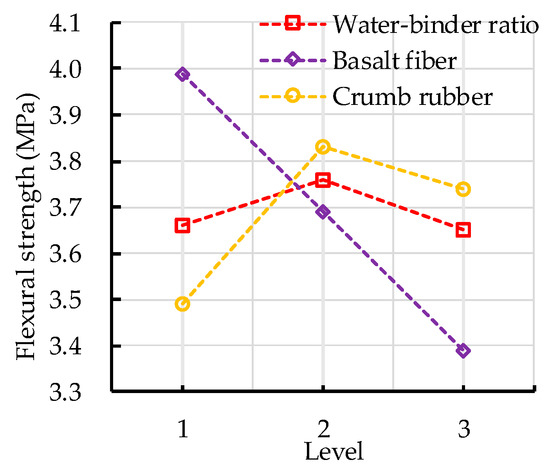 The variance analysis of the flexural strength of CRBFC is shown in Table 11. The significance level judgment of flexural strength is the same as compressive strength. It can be seen from Table 11 that the F value of basalt fiber content is greater than 19.0; this indicates that basalt fiber content has the most significant effect on the flexural strength of CRBFC. The F value of the crumb rubber replacement rate is between 9.0 and 19.0, which means the crumb rubber replacement rate has a significant effect on the flexural strength of CRBFC. The F value of the water–binder ratio is less than 3.0, which indicates that the effect of the water–binder ratio is least significant. The results are consistent with those of range analysis.