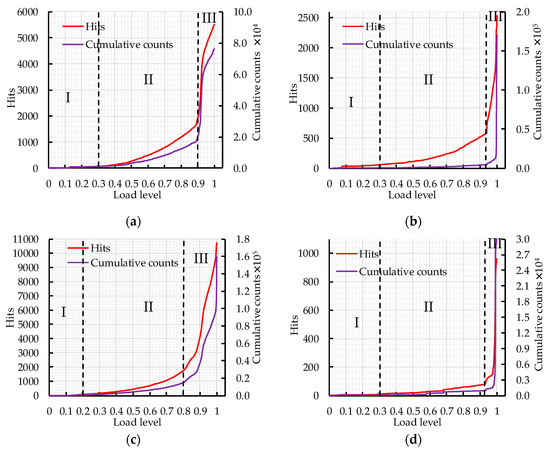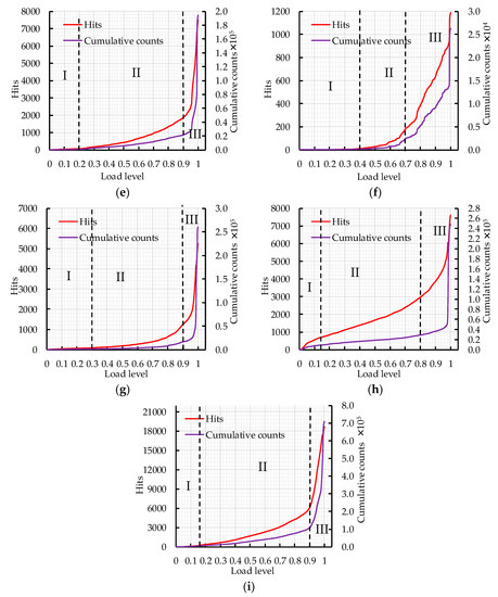 It can be seen from Figure 7 that the fracture process can be divided into three stages according to the curve curvature changes of cumulative AE hits and counts. In Figure 7f, stage II is short and the load level ranges from 0.4 to 0.7, which indicates that rapid crack expansion leads to concrete fracture during the loading process. In Figure 7c,h, the critical point of stage III is at the load level 0.8. The cumulative AE hits and counts increase rapidly in stage III; due to the appearance of macroscopic cracks, the cumulative counts increases sharply when it reaches 2500 and 5000 in Figure 7c,h, respectively, which represents the ultimate fracture of the concrete specimens. In Figure 7a,e,g,i, the critical point of stage III is at the load level 0.9; the cumulative AE hits and counts increase sharply at stage III and the concrete specimen fails. The cumulative AE hits and counts increase slowly in stage II, which indicates that the crack inside the concrete is in a stage of stable expansion. In Figure 7b,d, the critical point of the stage III is at the load level above 0.9. Most AE events occur in stage III, which indicates that most of the damage occurs in this stage.