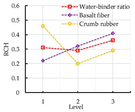 The variance analysis of RCH is shown in Table 13. It can be seen from the significance level judgment of RCH that the F values of crumb rubber replacement rate and basalt fiber content are greater than 19.0, which indicates that these two factors have the most significant effect on the RCH. The F value of crumb rubber replacement rate is greater than basalt fiber content, which means the effect of crumb rubber is more significant. The F value of water–binder ratio is between 9.0 and 19.0, which indicates that water–binder ratio has a significant effect on the RCH. The results are consistent with those of range analysis.