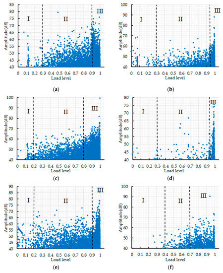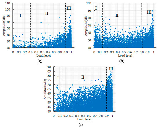 The AE amplitude value vs. load level is shown in Figure 9. AE amplitude value is divided according to cumulative AE hits and counts. It can be seen from Figure 9 that the AE amplitude has a great correlation with the fracture stage of concrete and the AE signal is less in the first stage, which is related to the less internal damage of concrete under the condition of low load level. In Figure 9f, most of the AE amplitude values are below 50 dB in stage II, the AE amplitude value reaches 60 dB at the boundary of stage II and III, and the AE amplitude value increases sharply for the second time when the macroscopic cracks appear. In Figure 9i, the AE amplitude value increases steadily in stage II and most of the AE amplitude values range from 40 to 60 dB; the AE amplitude value suddenly changes to 75 dB at the critical point of stage III and gradually increases with the increase in load level until the specimen fracture. In Figure 9a, most of the AE amplitude values are between 40 and 60 dB in stage II, the AE amplitude value reaches above 70 dB at the boundary of stage II and III, and, when the specimen is fractured, the AE amplitude reaches above 75 dB. In Figure 9c,e,g,h, most of AE amplitude values range from 40 to 60 dB, the AE amplitude value reaches more than 65 dB at the boundary of stage II and III, and the AE amplitude value reaches 75 dB when macroscopic fracture occurs. It should be noted in Figure 9h that the AE amplitude is more than 65 dB in stage I, which is related to the phenomenon that a large microcrack appears in the concrete and releases a high-strength elastic wave. In Figure 9b, the AE amplitude value appears to mutate at the boundary of stage II and III and increases from below 55 dB to above 60 dB; the AE amplitude value reaches 75 dB when the concrete fractures. In Figure 9d, most of the AE amplitude values are below 55 dB in stage II; the AE amplitude value reaches 65 dB at the boundary of stage II and III, and the AE amplitude increases suddenly for the second time and reaches 75 dB when macroscopic fracture occurs. The number of AE signals increases suddenly when the concrete fracture stage changes and the AE amplitude value increases sharply at the boundary of the fracture stage. Hence, AE amplitude value could be used as an early warning of concrete structure fractures.