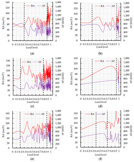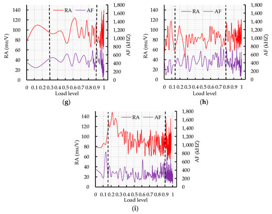 The RA and AF values vs. load level are shown in Figure 10. The fracture mode of CRBFC under flexural conditions was analyzed according to the dynamic change of RA and AF values during the loading process. In order to reduce scattering and make the trend clear, each point on the curve is the moving average of nearly 50 AE hits. In the cracking process of concrete, the logical sequence of crack initiation starts with tensile cracking of the concrete matrix; the fiber friction and pull-out events start to occur as the crack length increases and the shear mode becomes more active [45,46]. Compared with the tensile mode, the shear mode has a higher RA value and lower AF value. As shown in Figure 10, RA and AF values curves fluctuate continuously with the increase in load level. This is related to the dynamic fracture behavior of concrete. In Figure 10a, the RA value increases significantly in the failure stage and the AF value shows a downward trend in the loading process, which indicates that the shear mode dominates the fracture in the failure stage. In Figure 10b, RA and AF values show steady fluctuation in the first two stages and RA value reaches peaks and AF value sharp drops at the moment of fracture. This is related to the transformation of the fracture mode. The sudden change in RA and AF values could reflect the transformation of the fracture mode, which is consistent with the results obtained by Souliout [46]. In Figure 10c, the RA value increases to 110 ms/V and the AF value decreases to 240 kHz in the failure stage compared with the initial RA and AF values, which indicates that the shear mode dominates the fracturing of concrete. In Figure 10d, the RA value shows a rising trend while the AF value changes little in the first two stages; the RA value reaches a peak and AF value sharply drops at the moment of concrete fracture. In Figure 10e, the RA and AF values gradually increase with the increase in load level when the load level is below 0.9, which indicates that a coupling effect of shear mode and tensile mode exists. The shear mode that dominates the concrete fracture is expressed by the increase in the RA value to 110 ms/V and the drop of AF value to below 240 kHz. In Figure 10f, the shear fracture of concrete is expressed by the increase in the RA value to 110 ms/V and the drop of AF value to below 240 kHz. In Figure 10g, the RA and AF values of the initial tensile crack are 80 ms/V and 400 kHz, respectively. The shift from tensile mode to shear mode is expressed by the increase in RA value to 110 ms/V and the drop of AF value to below 240 kHz. In Figure 10h, the RA and AF values of the initial tensile crack are 50 ms/V and 400 kHz, respectively. In the loading process, most of the RA values are above 50 ms/V and most of the AF values fluctuate in the range of 200 kHz and 600 kHz, which is related to the shear effect caused by fiber friction and pulling out. The RA value increases to 110ms/V and the AF value decreases to below 240 kHz at the moment of shear fracture of concrete. In Figure 10i, compared with the initial RA value and AF value, the RA value increases to 110 ms/V and the AF value decreases to below 200 kHz in the failure stage, which represents the transformation from tensile mode to shear mode. In the loading process, the initial crack in CRBFC is a tensile crack and the RA and AF values of the initial crack are below 80 ms/V and above 400 kHz, respectively. The shear mode that dominates the failure stage of CRBFC is expressed by the increase in RA value to 110 ms/V and the drop in AF value to 240 kHz.
