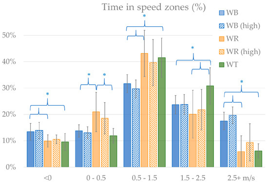 Distribution of time spent in speed zones, with significant (p < 0.05) differences marked with *.